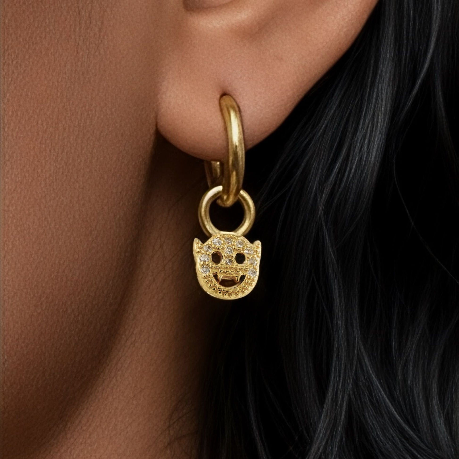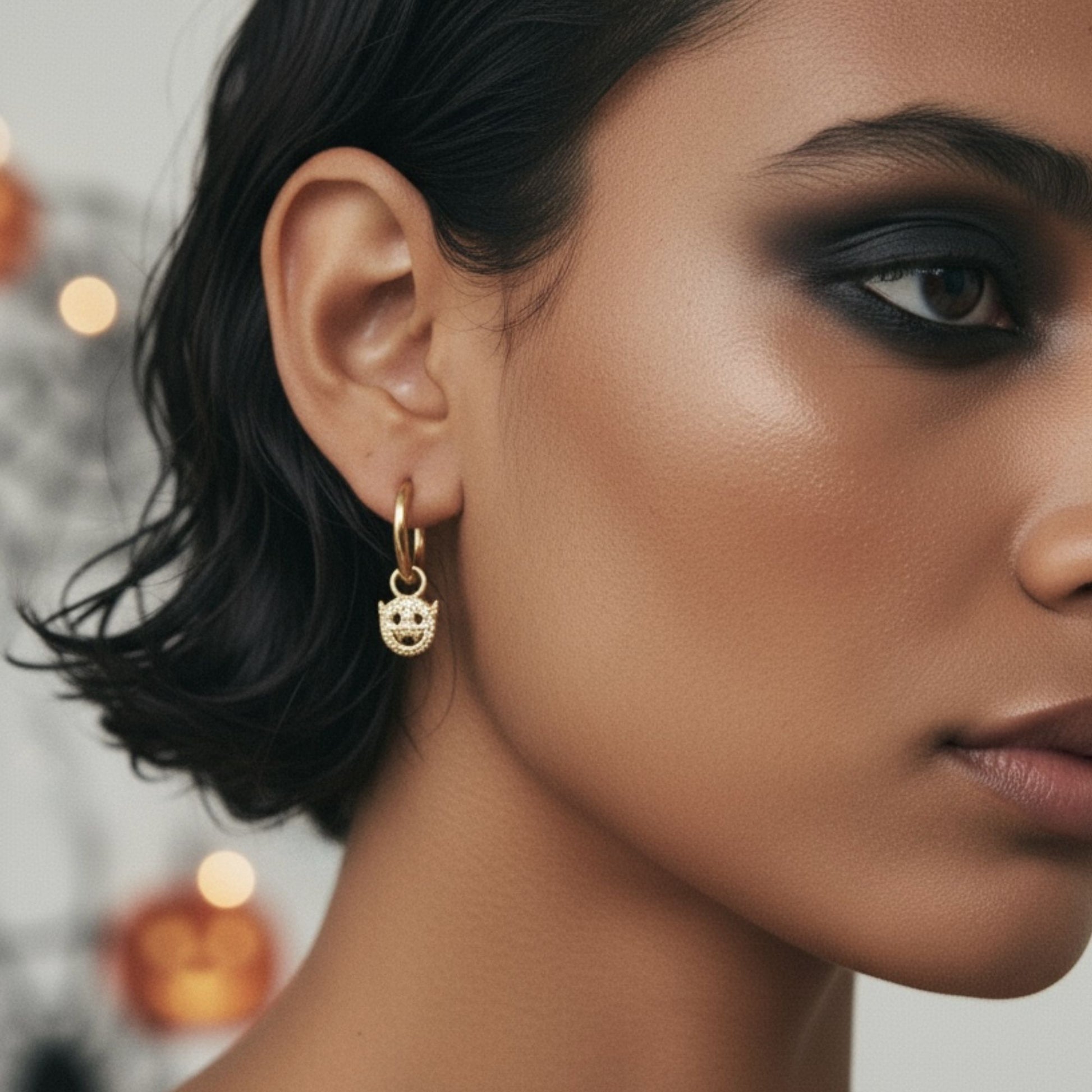 Un mini masque espiègle serti d’éclats qui apporte une pointe d’audace à n’importe quelle créole. Le charm FREAKY capte la lumière, twiste instantanément une composition d’oreille et reste ultra confortable au quotidien. Pièce exclusive Halloween, pensée pour se mixer à tes créoles Talismara.