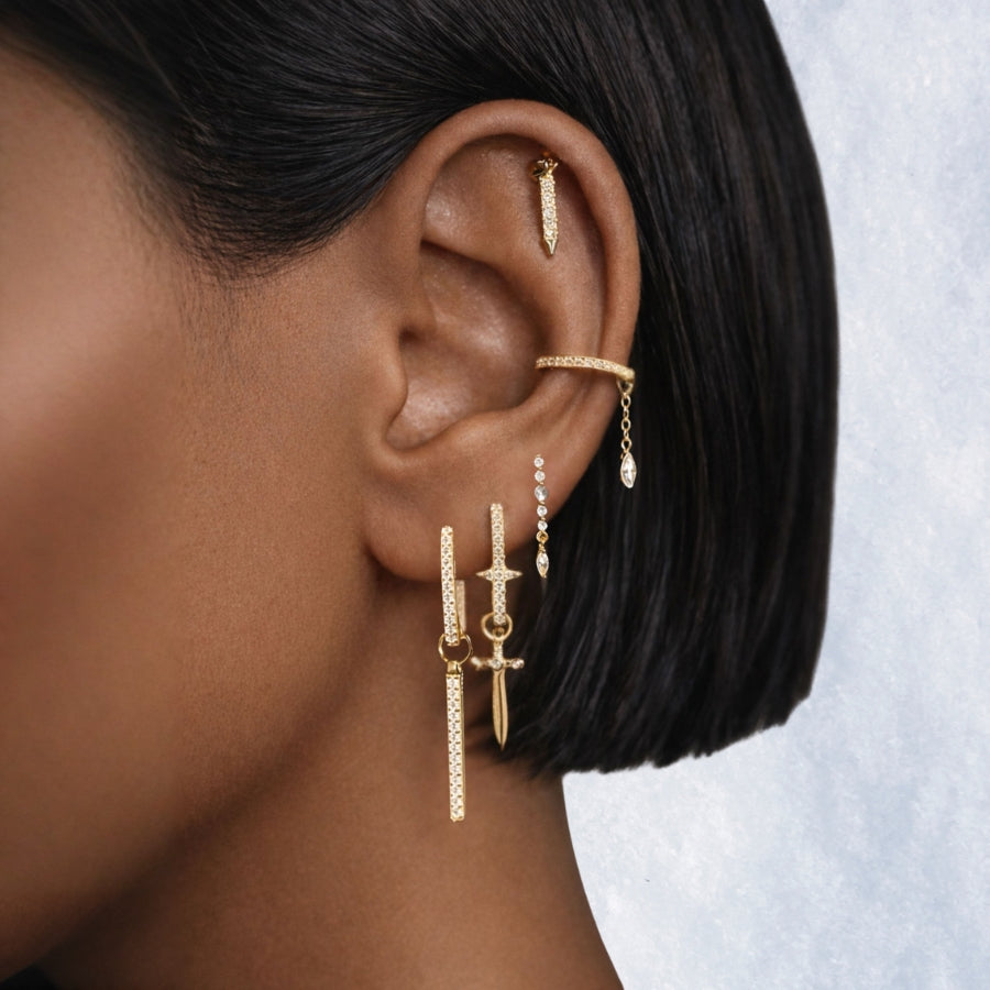 Composition EPIC ✨ impose une allure puissante et structurée : des lignes verticales serties, une pointe dorée et une chaîne fine dessinent une composition affirmée et graphique. Un équilibre maîtrisé entre force et éclat, pensé pour celles qui aiment les bijoux au caractère marqué.
