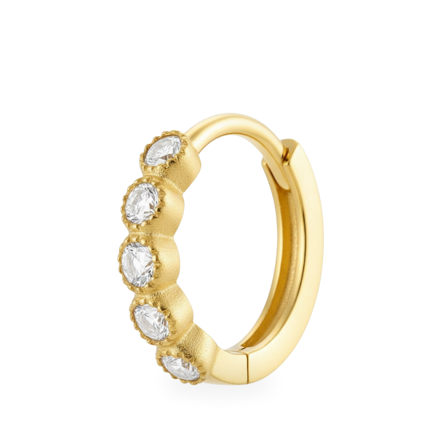 La boucle d’oreille Bubble revisite la mini créole avec une touche de douceur et d’éclat. Son anneau circulaire est orné de zircons ronds incrustés, créant un effet lumineux et raffiné qui capte la lumière à chaque mouvement.